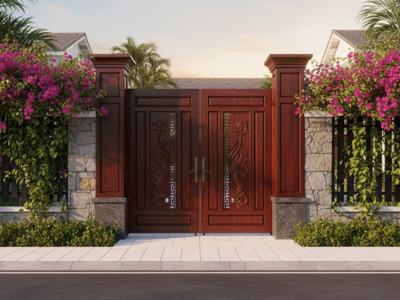 Cổng gỗ là sự lựa chọn hoàn hảo cho những gia đình yêu thích sự tự nhiên và ấm áp. Các loại gỗ phổ biến được nhiều gia chủ lựa chọn như gỗ lim, gỗ hương hoặc gỗ công nghiệp đã qua xử lý chống mối mọt. Mẫu cổng gỗ đôi khi sẽ được kết hợp thêm kim loại để tăng tính bền bỉ và bền vững hơn.